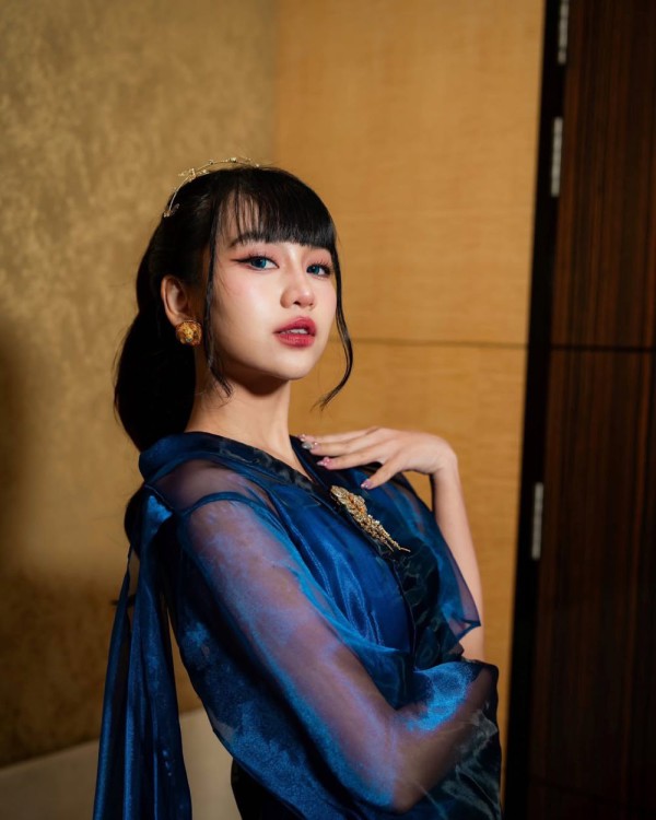 3. Dengan menunjukkan tatapan yang tajam, Ghea memilih softlens berwarna biru dikombinasikan dengan cat eyeliner sangat tebal. Eyeshadow warna merah muda memberi kesan lembut pada kelopak matanya.