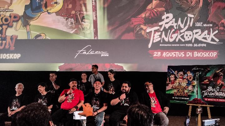 Tim Falcon Pictures bersama para pemeran dan tamu lainnya dalam acara konferensi pers untuk film animasi Warkop DKI Kartun serta Panji Tengkorak Animasi yang diselenggarakan di Kemang Village, Jakarta Selatan, pada hari Senin tanggal 2 Juni 2025. TEMPO/Muhammad Rifan Prianto